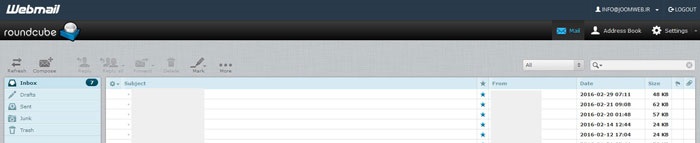 در این مرحله به صفحه ی اصلی Roundcube باز می شود و قسمت ایمیل های دریافتی شما (inbox) قابل رویت می باشد. در قسمت سمت چپ صفحه نیز پوشه ی ایمیل ها قابل رویت می باشد و به صورت پیش فرض پس از لاگین به Roundcube پوشه ی اینباکس باز می شود.