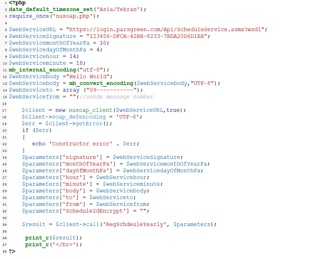 نمونه کد php ارسال اس ام اس خودکار سالانه روش nusoap