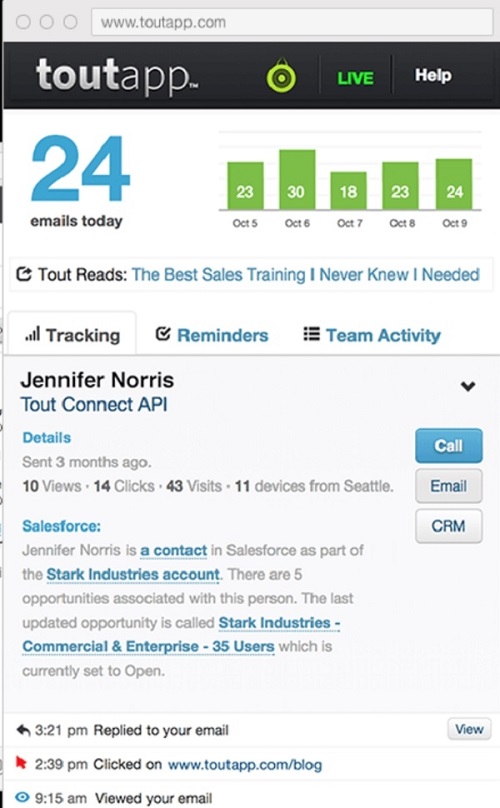 این سرویس خود را به عنوان پلت فرم پیش رونده می داند و ویژگی هایی مثل زمان باز شدن ایمیل، خوانده شدن پرزنتیشن ارسال شده و غیره را ارائه می دهد. با استفاده از ToutApp به صورت آنلاین نسبت به اتفاقاتی که میفتد، دید کاملی خواهید داشت. اتفاقاتی مثل نرخ کلیک کردن، زمان ارسال مجدد ایمیل شما، صفحاتی که درصورت پیوست شما بازدید کرده اند را متوجه خواهید شد.